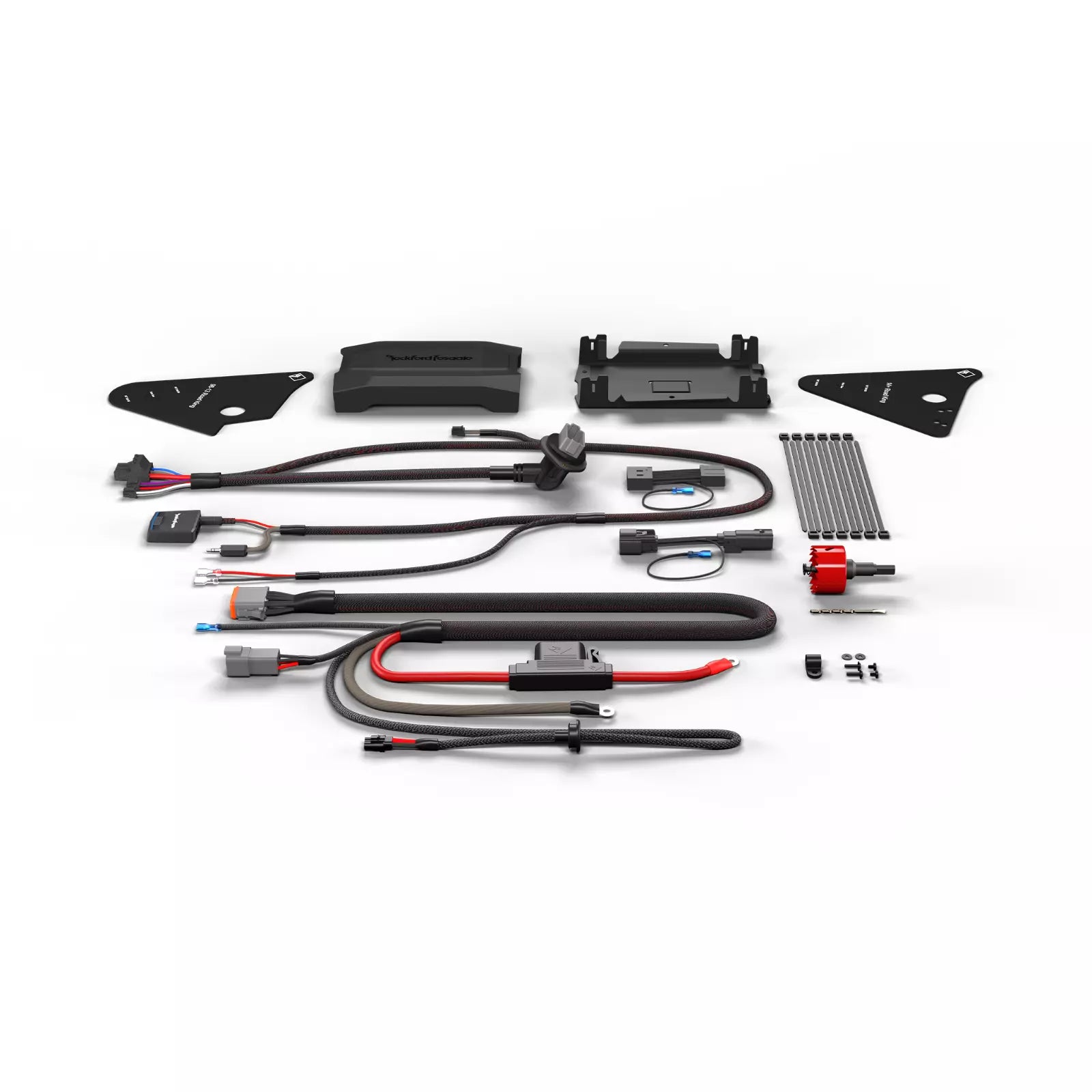 The Rockford Fosgate RFK-HDRK is a comprehensive amplifier installation kit designed for select 1998-2013 and 2014+ Harley-Davidson Road King models with factory hardshell bag lids. This plug-and-play kit is specifically crafted to retain maximum saddlebag storage while providing a seamless solution for installing a Rockford Fosgate TM400X4ad 400-watt amplifier (sold separately). The kit includes a complete wiring harness, amplifier mounting carrier, and factory integration harnesses for effortless installation and reliable performance.