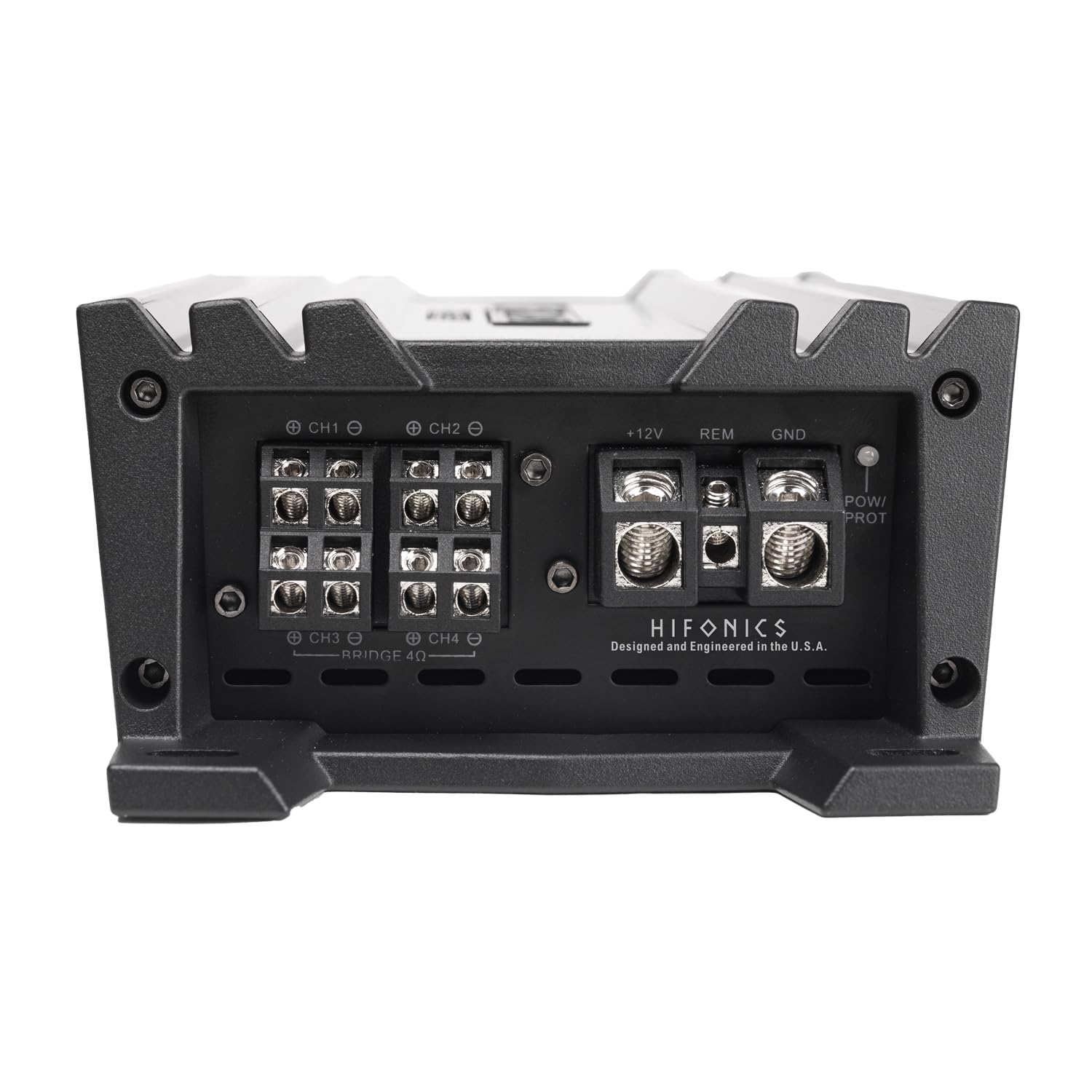 The Hifonics Colossus Mini HCM-800.4D is engineered with premium components like Ultra-Fi MOSFETs for superior power output and thermal dissipation. Triple protection circuits safeguard the amplifier and your audio system from over/under voltage, short circuits, and thermal damage. Additionally, the amplifier is equipped with nickel-plated RCA inputs and a molded connection terminal for corrosion-resistant, efficient connections. A delayed turn-on function ensures smooth, noise-free startup, making it a reliable addition to any audio setup.