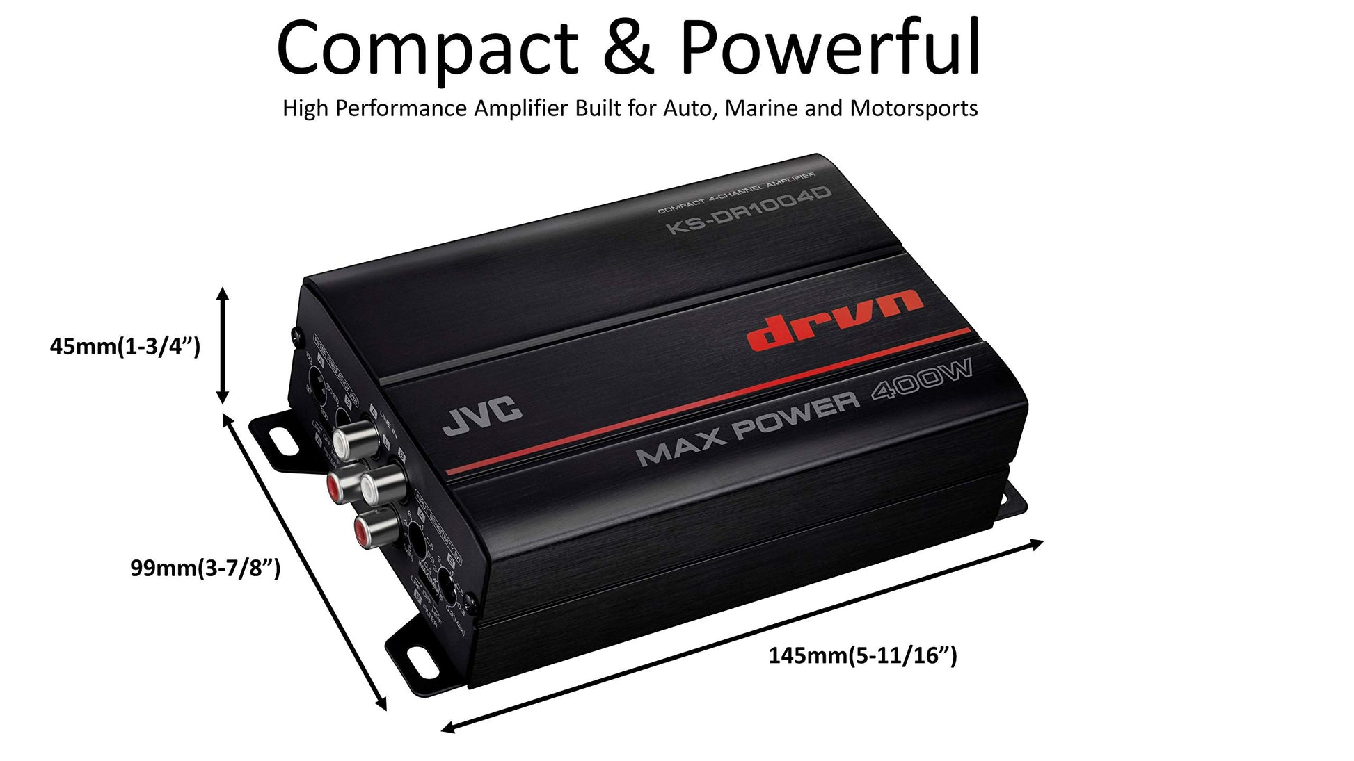 The JVC KS-DR1004D delivers powerful sound in a small footprint, making it ideal for cars, motorcycles, boats, and powersports vehicles. Despite its compact size, this Class D amplifier outputs 45W RMS x 4 at 2–4 ohms or 90W RMS x 2 when bridged, providing flexible installation and strong audio performance for a wide range of systems.