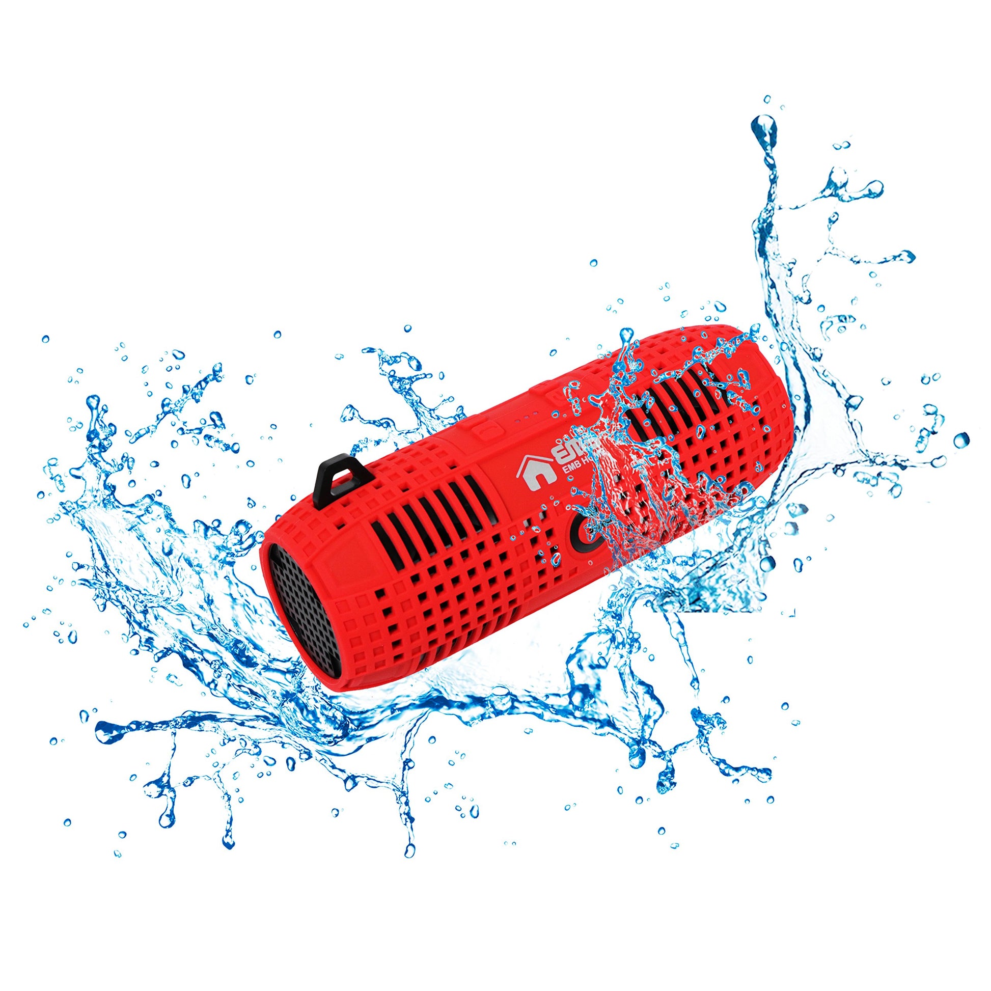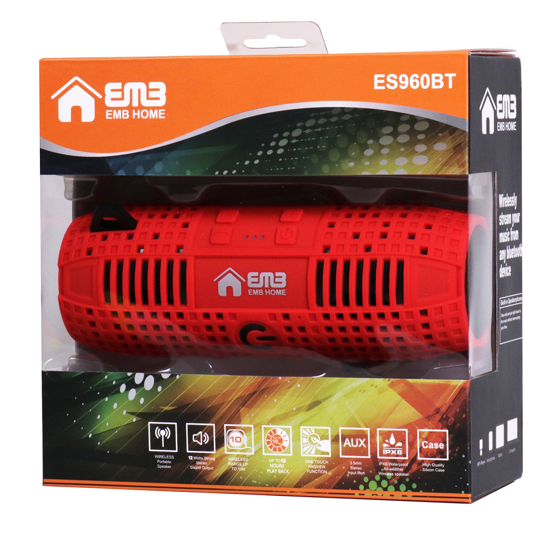 Take your music with you wherever you go. The EMB ES960BT-R features a tough rubber exterior that’s waterproof and resistant to the elements, making it perfect for outdoor activities like kayaking, mountain climbing, or even a shower. With its rugged build and sleek two-tone color design, this speaker is not only durable but also stylish, combining practicality and modern aesthetics for the ultimate audio experience on the move.