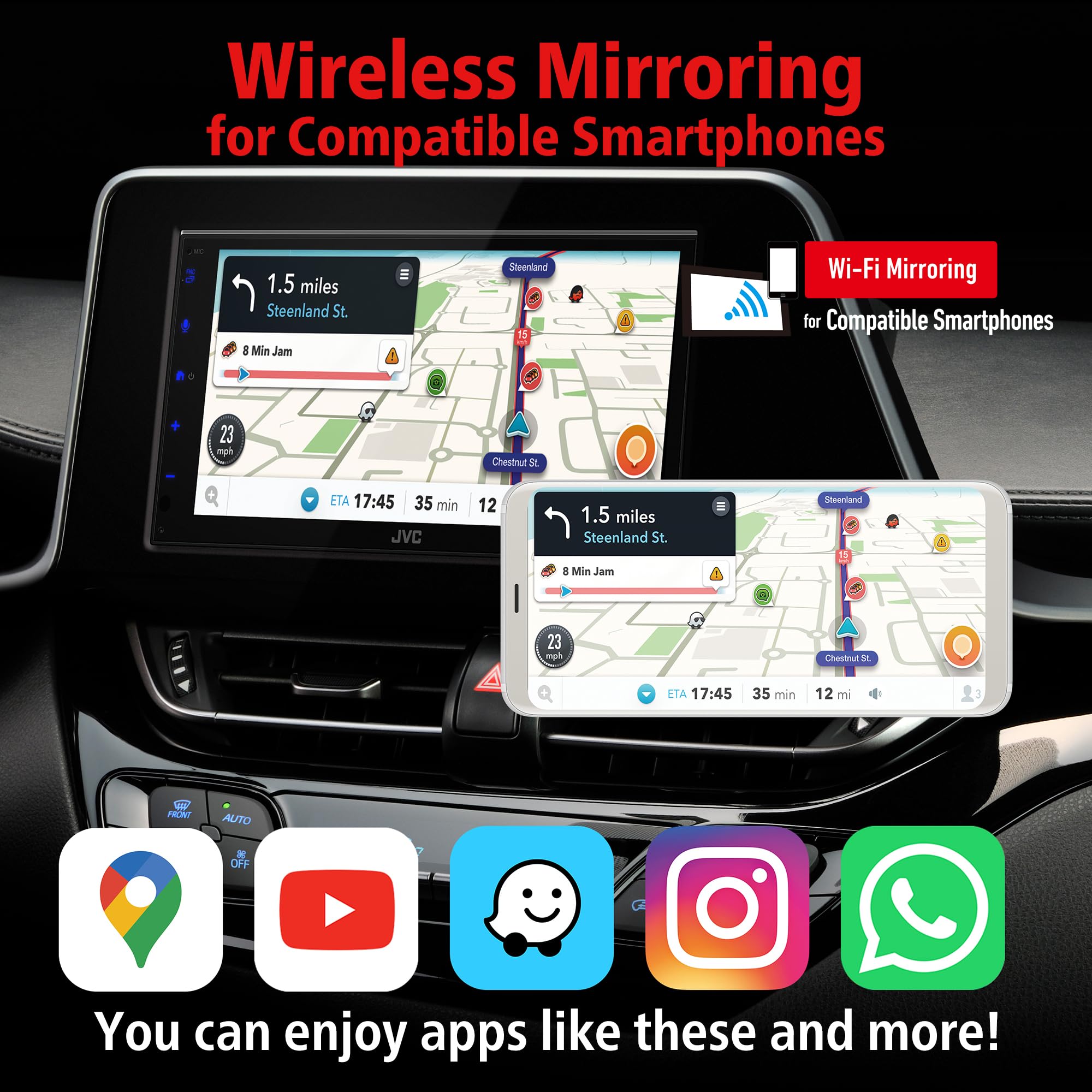 The JVC KW-M690BW offers seamless wireless Apple CarPlay® and Android Auto™ connectivity, letting you access navigation, calls, music, and messages effortlessly. With its responsive 6.8" capacitive touchscreen, managing your entertainment and communication has never been easier.