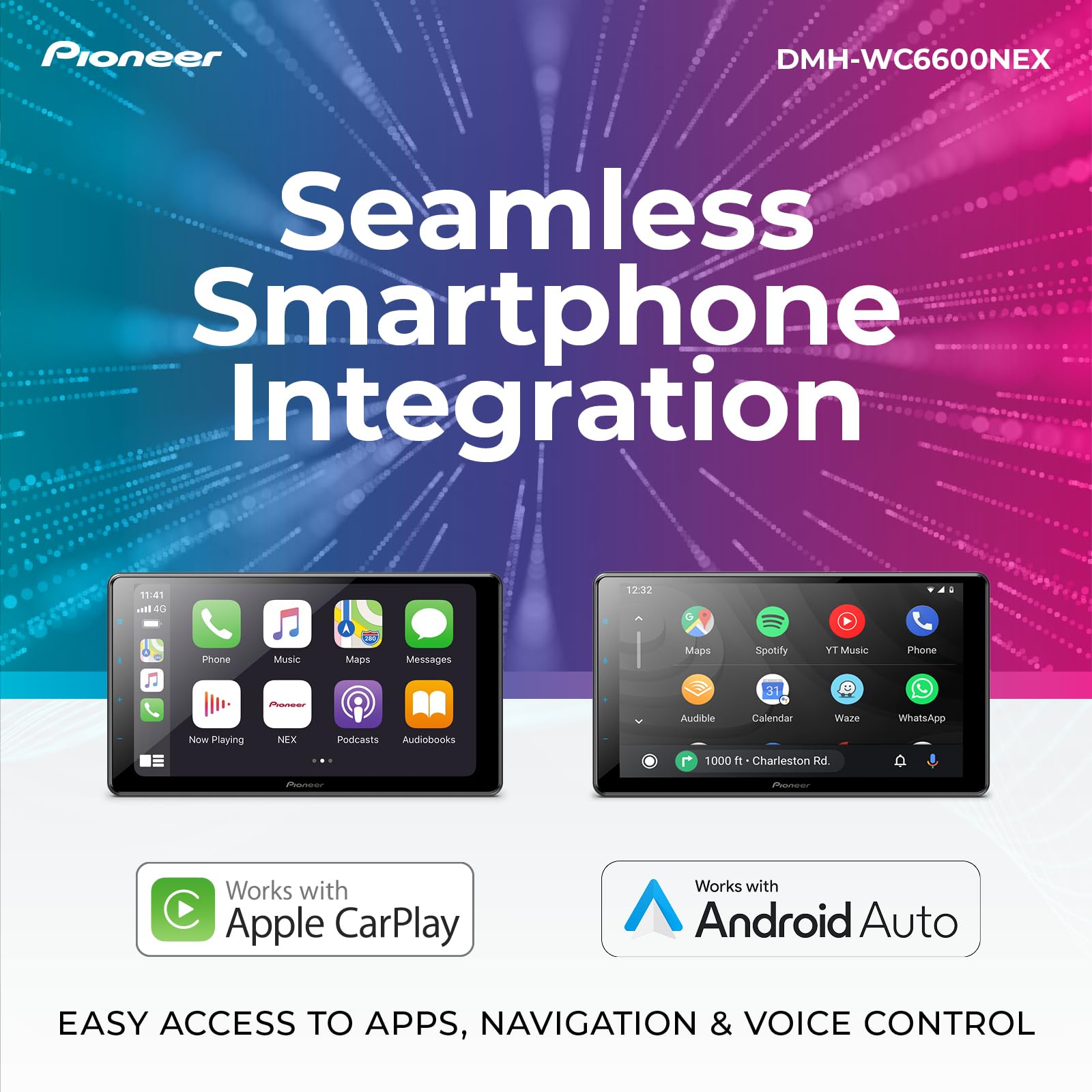 The Pioneer DMH-WC6600NEX sets a new standard in in-car connectivity with its support for wireless Apple CarPlay and Android Auto. Enjoy seamless integration with your iPhone or Android device, allowing you to access your favorite apps like Maps, Music, Messages, Phone, Podcasts, and more, all from the large 9" floating capacitive touchscreen. With wireless functionality, you can connect your smartphone without the hassle of cables, keeping your car interior neat and clutter-free. Stay connected and safe while accessing essential features on the road, with Siri voice commands on Apple CarPlay and Google Assistant on Android Auto, offering hands-free control for a safer, more efficient driving experience.