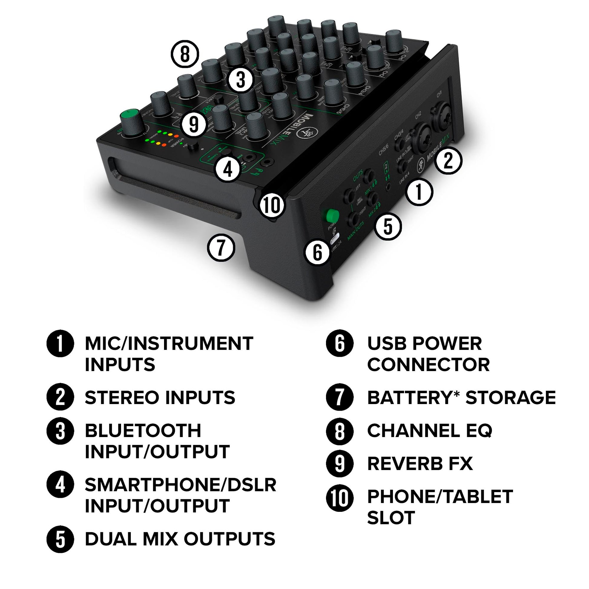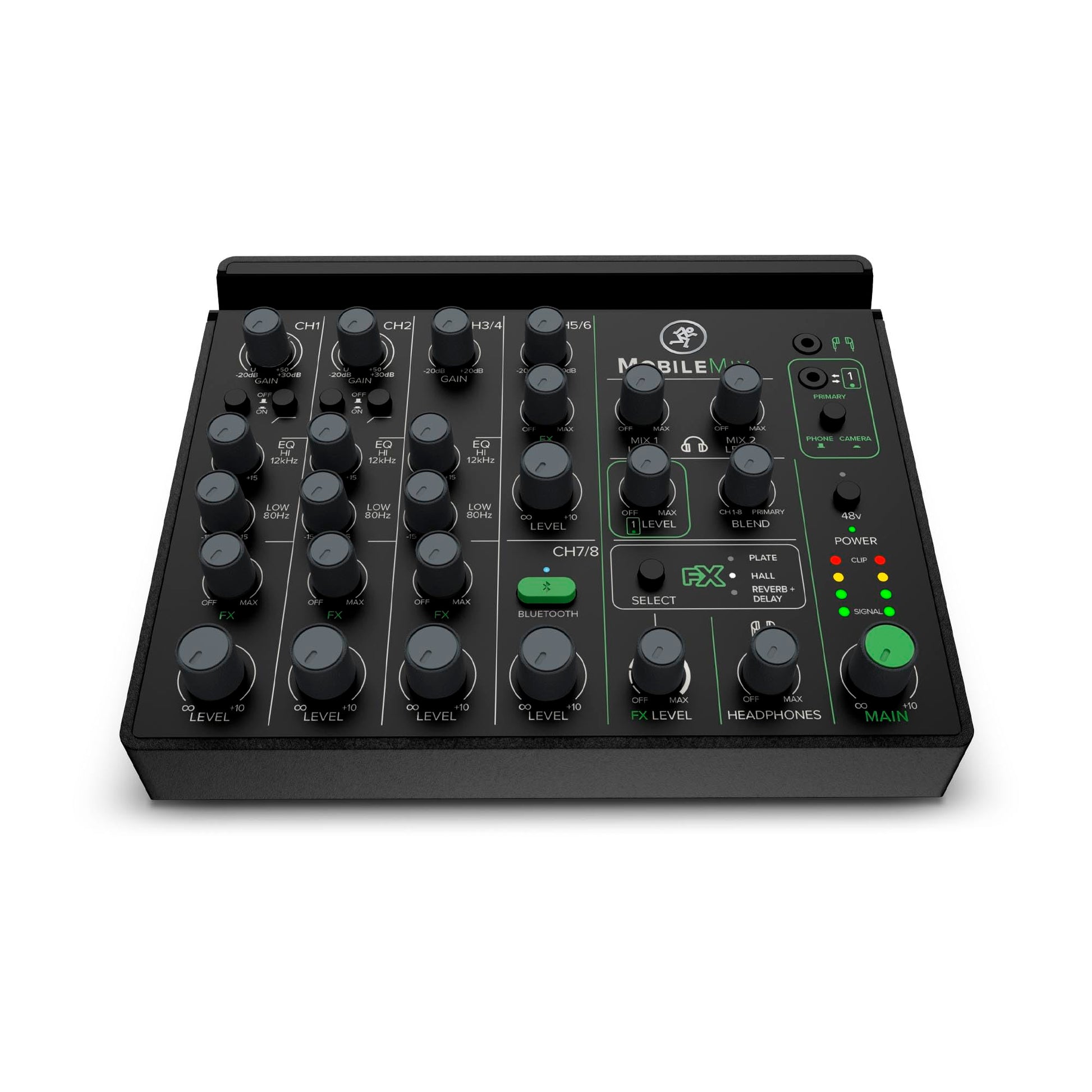 The Mackie MobileMix 8-Channel Mixer is designed for creators on the go, offering a compact, USB-powerable solution for musicians, podcasters, and content creators. Featuring two mic/instrument combo inputs, stereo line inputs, and Bluetooth connectivity, this mixer provides flexible routing and professional-quality sound in a highly portable package. Whether you're recording a podcast, streaming live, or capturing high-quality audio for a DSLR camera, the MobileMix is your go-to solution for mobile audio mixing.