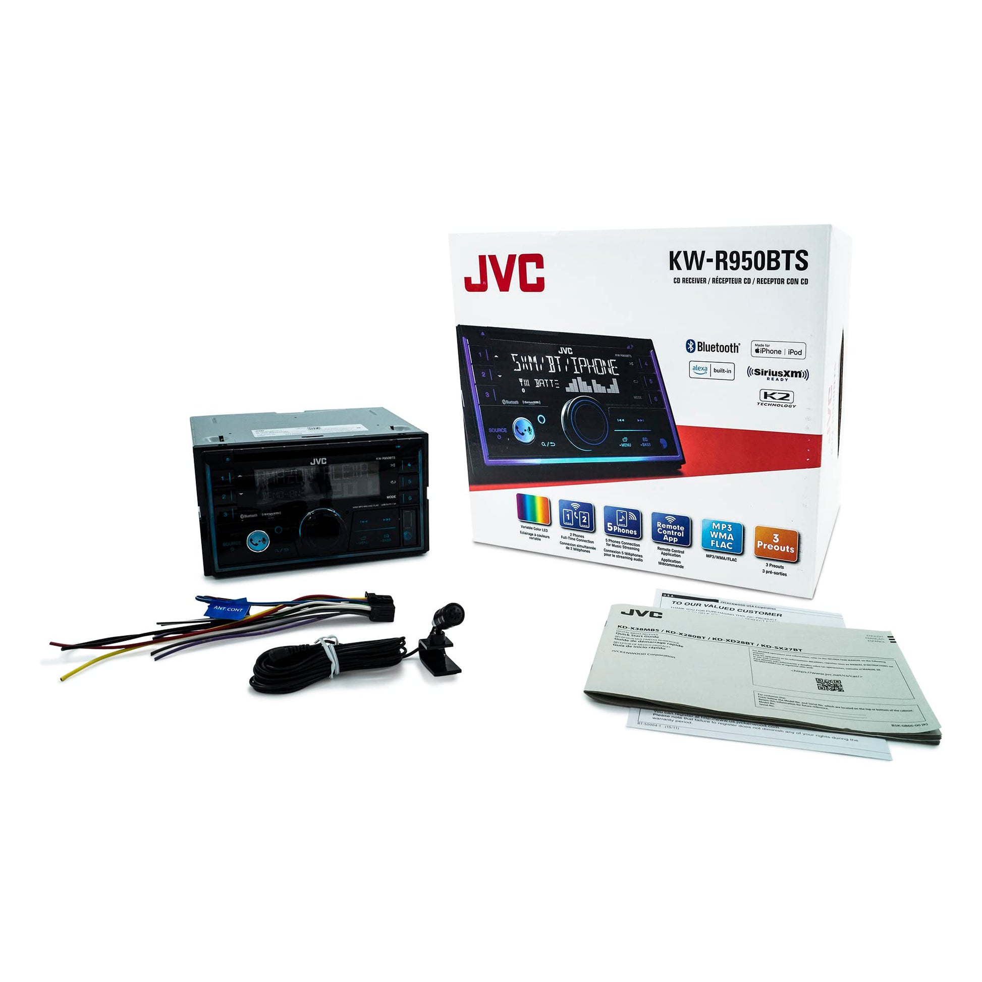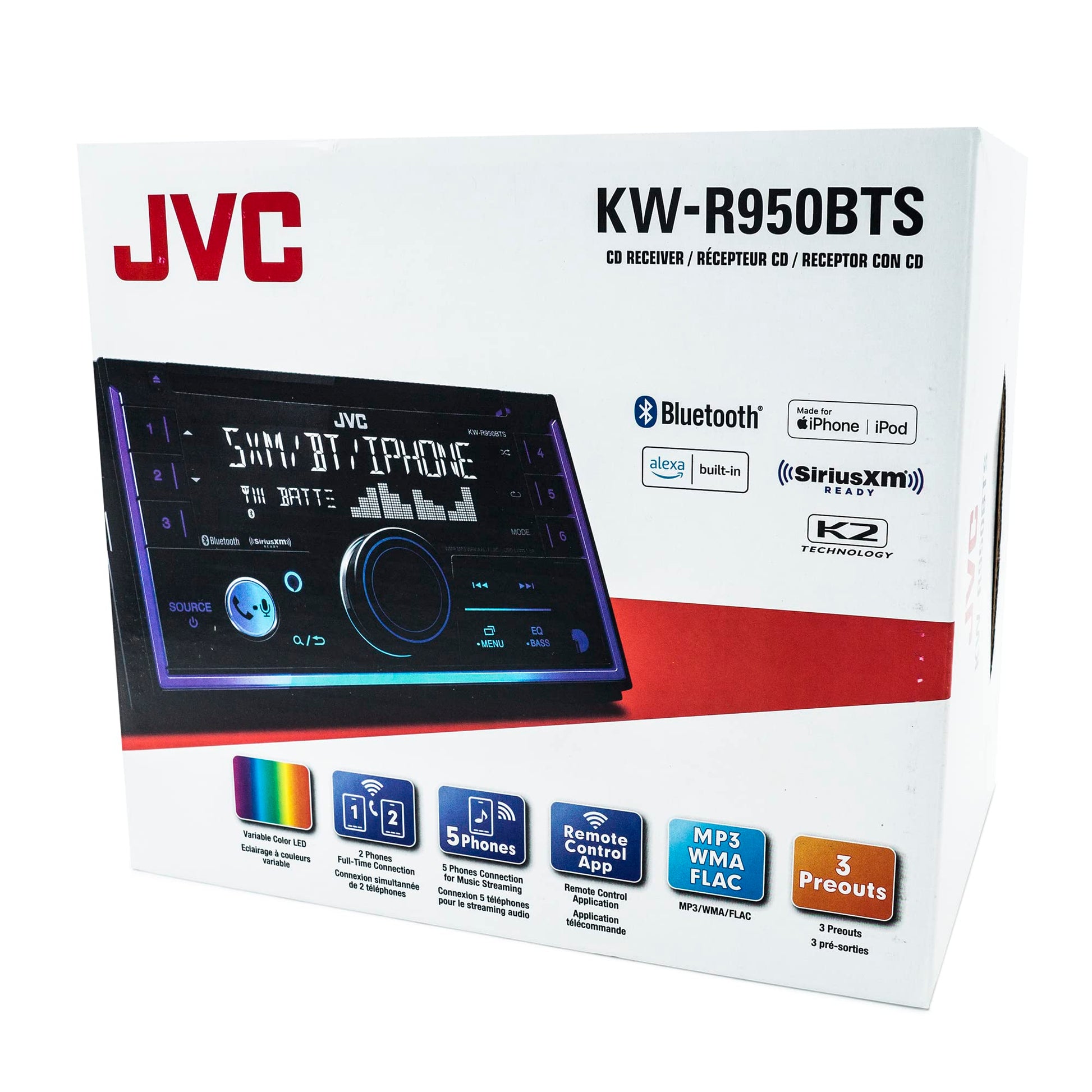 With its high-contrast 2-line LCD display and variable-color illumination, the JVC KW-R950BTS looks as good as it performs. Designed for double-DIN dash openings, it features a user-friendly layout with a front-panel auxiliary input and USB port for easy connectivity. Six-channel preamp outputs, including 4-volt front, rear, and subwoofer options, provide flexibility for customized audio setups, making it a versatile choice for any vehicle.