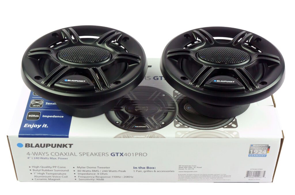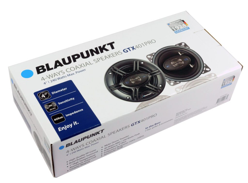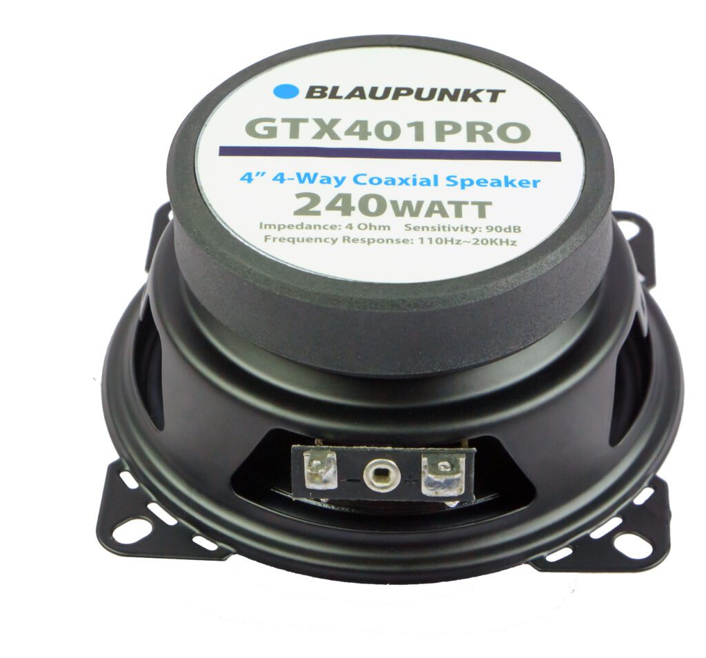 The Blaupunkt GTX-401PRO 4" 4-Way Car Speaker is engineered to provide an enhanced audio experience in your vehicle. Featuring a frequency response range from 110Hz to 20kHz, this speaker delivers clear midrange, detailed highs, and balanced bass, making it perfect for any music genre. The 4-way design, with its dedicated components for each frequency range, ensures that you hear every detail of your music with clarity and precision, whether you're listening to vocals or complex instrumental tracks.