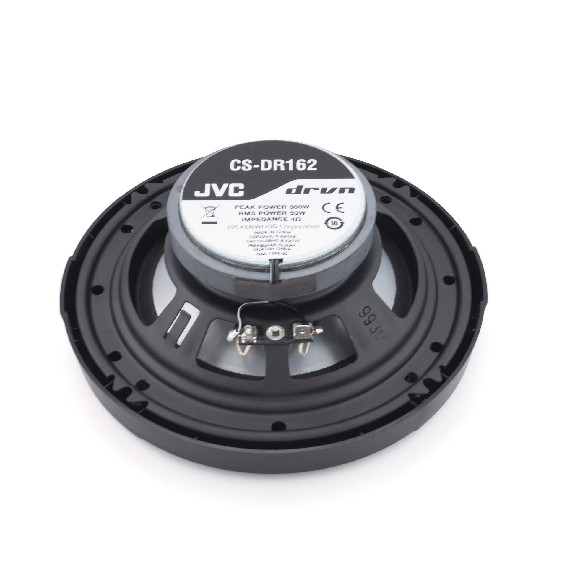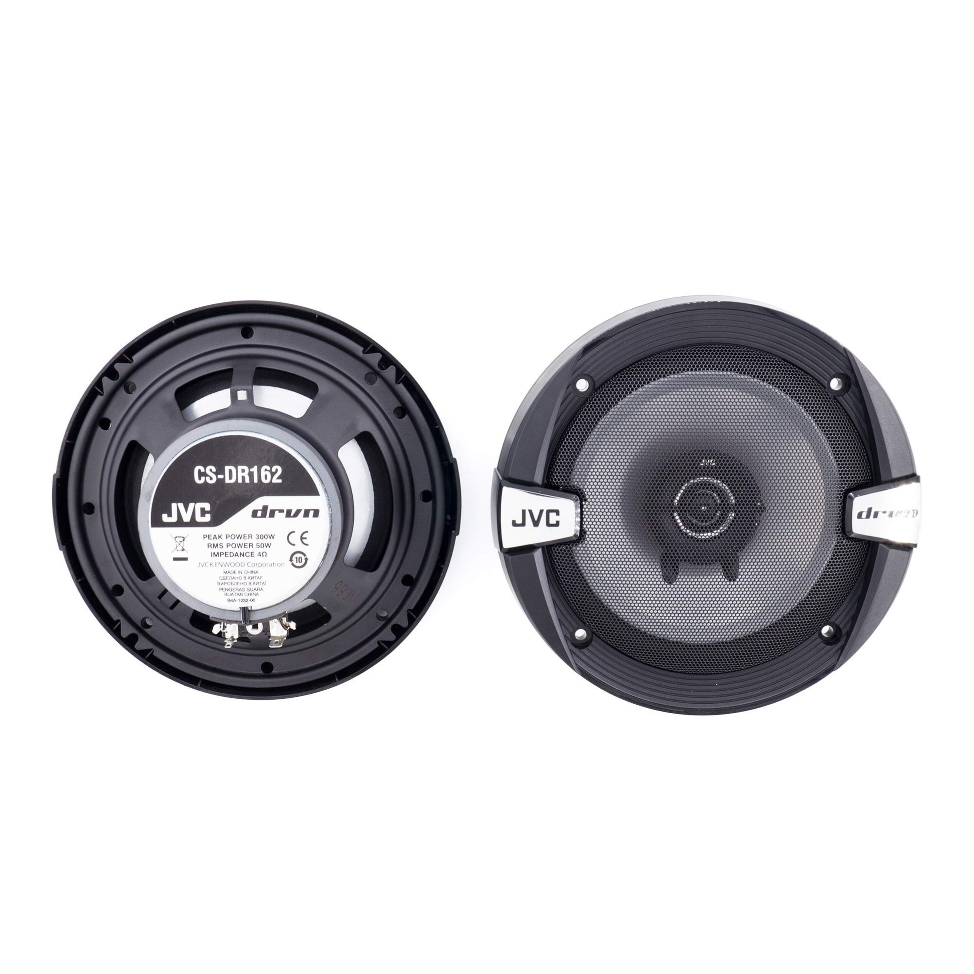 The JVC CS-DR162 DRVN Series 6.5" coaxial speakers deliver clear mids, crisp highs, and responsive bass in a compact design. With 300 watts peak power, they are perfect for upgrading factory-installed car audio systems without taking up extra space.