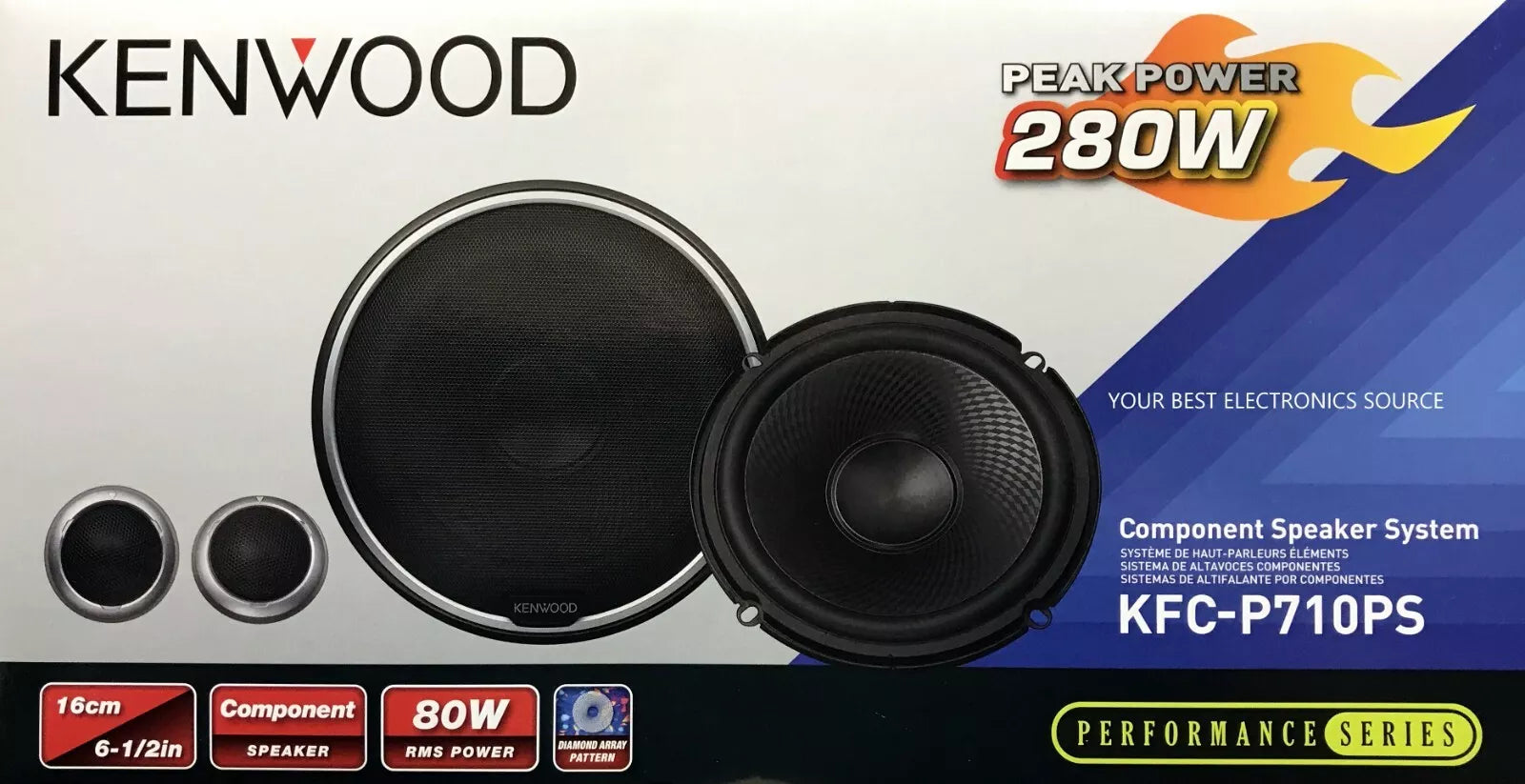 Experience immersive audio with the Kenwood KFC-P709PS 6.5" Component Speaker System. This top-tier speaker combines a high peak power of 280W with an 80W RMS rating, delivering deep bass and crisp highs. The diamond array polypropylene cone enhances sound clarity, while the 1" swivel dome tweeter offers precise sound directionality. With a frequency response range from 63Hz to 24kHz, this system brings out the full spectrum of your music for a premium in-car listening experience.