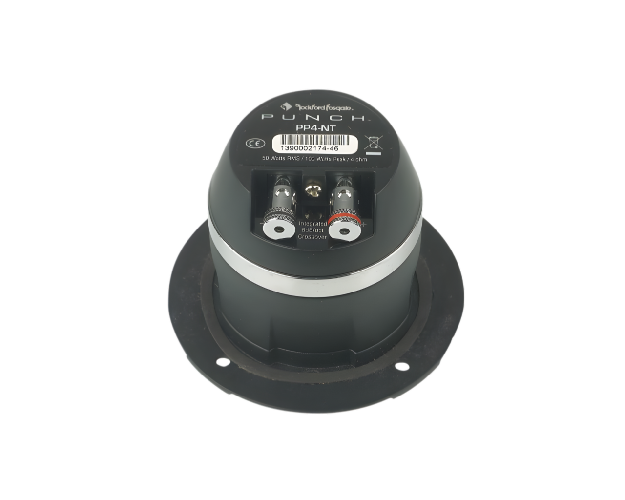The Rockford Fosgate PP4-NT Punch Pro 1" Horn Tweeter is engineered to perform at high SPL levels, delivering clean and powerful high frequencies even in extreme conditions. Built with a neodymium motor structure and a high-power diaphragm, this tweeter ensures maximum output and sensitivity. The billet-machined aluminum phase plug reduces distortion, while the integral 6dB high-pass crossover ensures optimal frequency performance. With 50 watts RMS and 100 watts max power handling, the PP4-NT is designed to handle the most demanding professional audio systems. Sold individually, it includes mounting hardware for easy setup and comes with a full 1-year warranty.