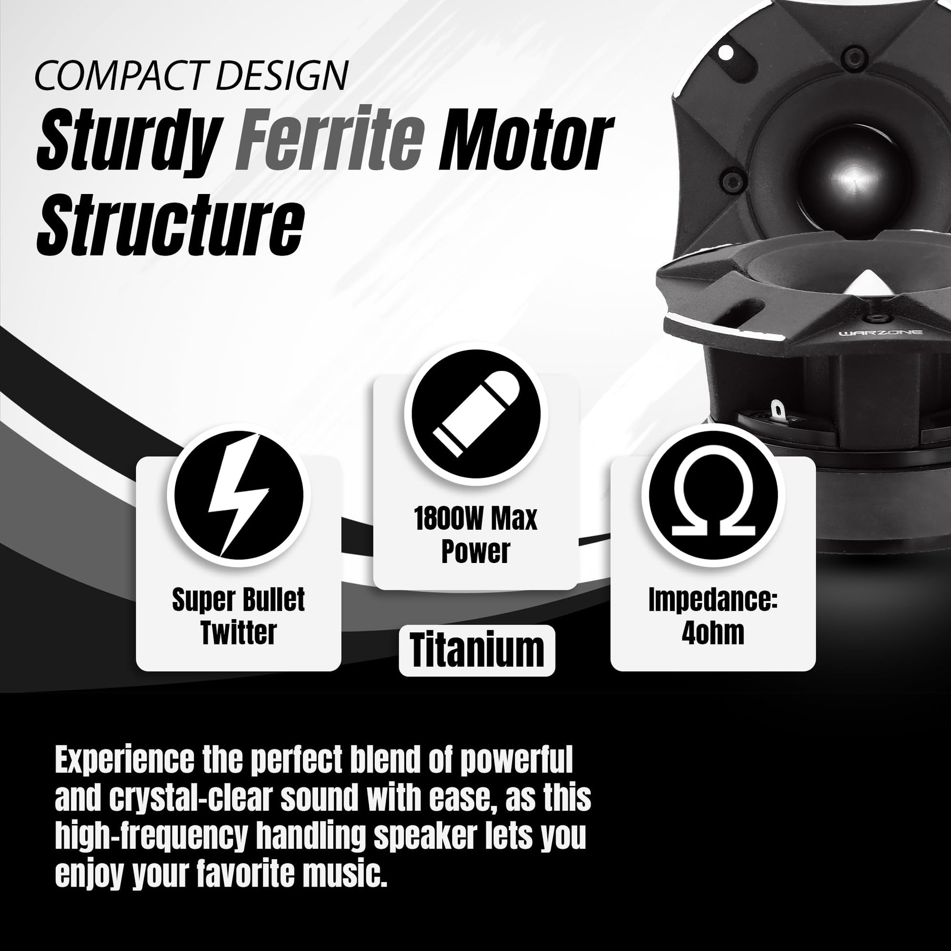 Experience powerful and precise sound with the Gravity Warzone WZ80TW super tweeter. Designed for both car and professional audio systems, this 4.81-inch tweeter delivers exceptional performance with its 1800W max power and 103dB sensitivity. The titanium diaphragm and CCAW voice coil ensure premium sound quality and durability, while the 20.3-ounce magnet guarantees consistent operation. Compact yet robust, the WZ80TW is perfect for capturing high-frequency tones with clarity and precision, making it an excellent choice for upgrading your audio setup.