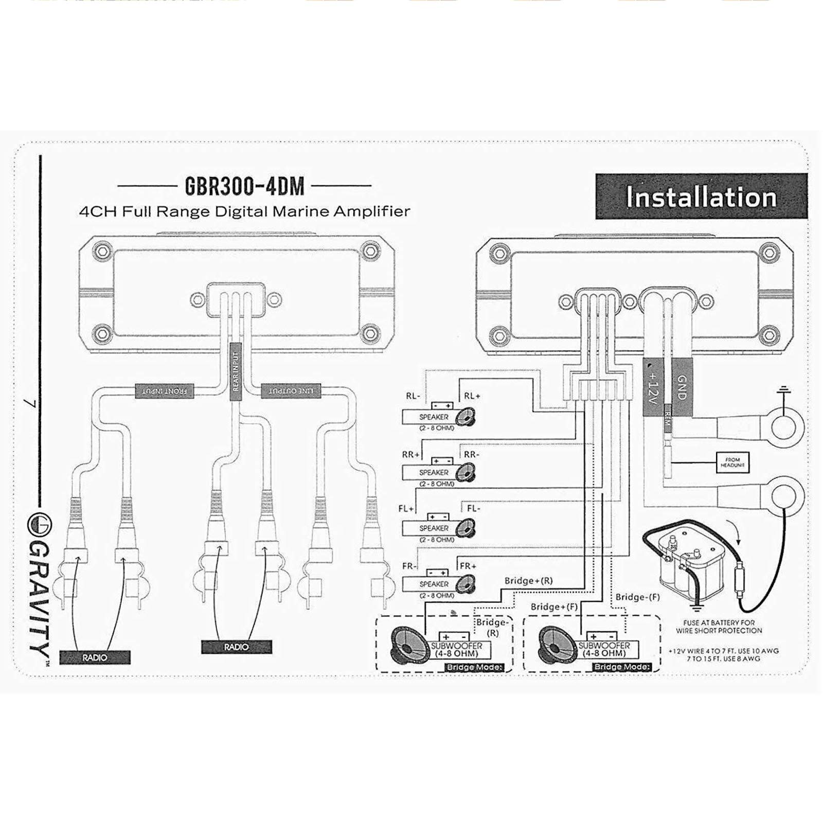 Constructed with durability in mind, the Gravity GBR300.4DM amplifier features an IPX65 waterproof design, which makes it resistant to water, dust, and other outdoor elements. This means you can enjoy exceptional sound performance in nearly any environment, whether you're exposed to rain, humidity, or even splashes from the water. Built to last, the GBR300.4DM is the ideal amplifier for those who want a reliable, high-performance audio system that can endure challenging conditions while maintaining top-notch sound quality.