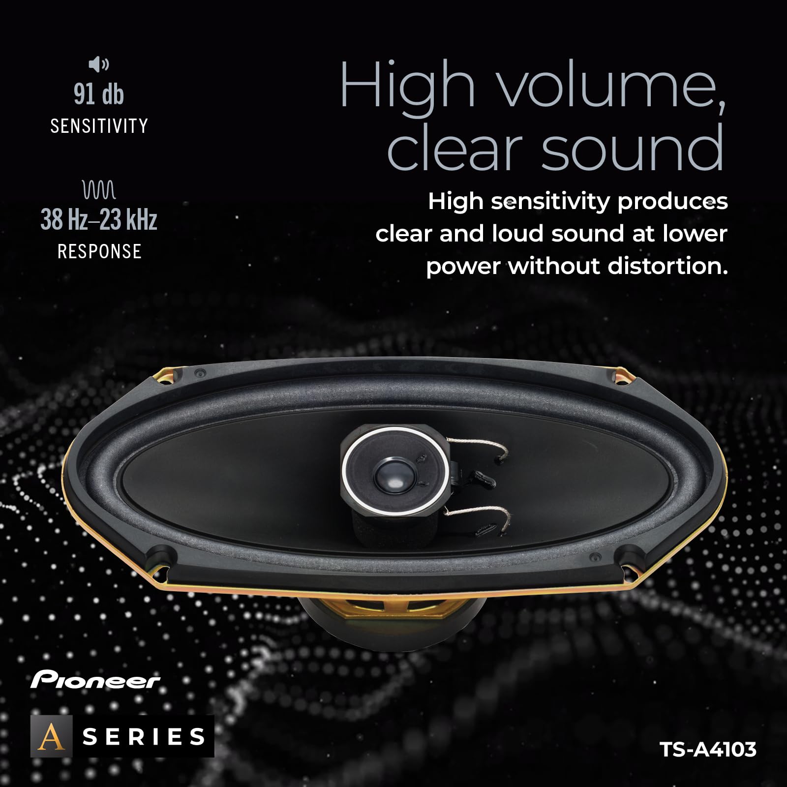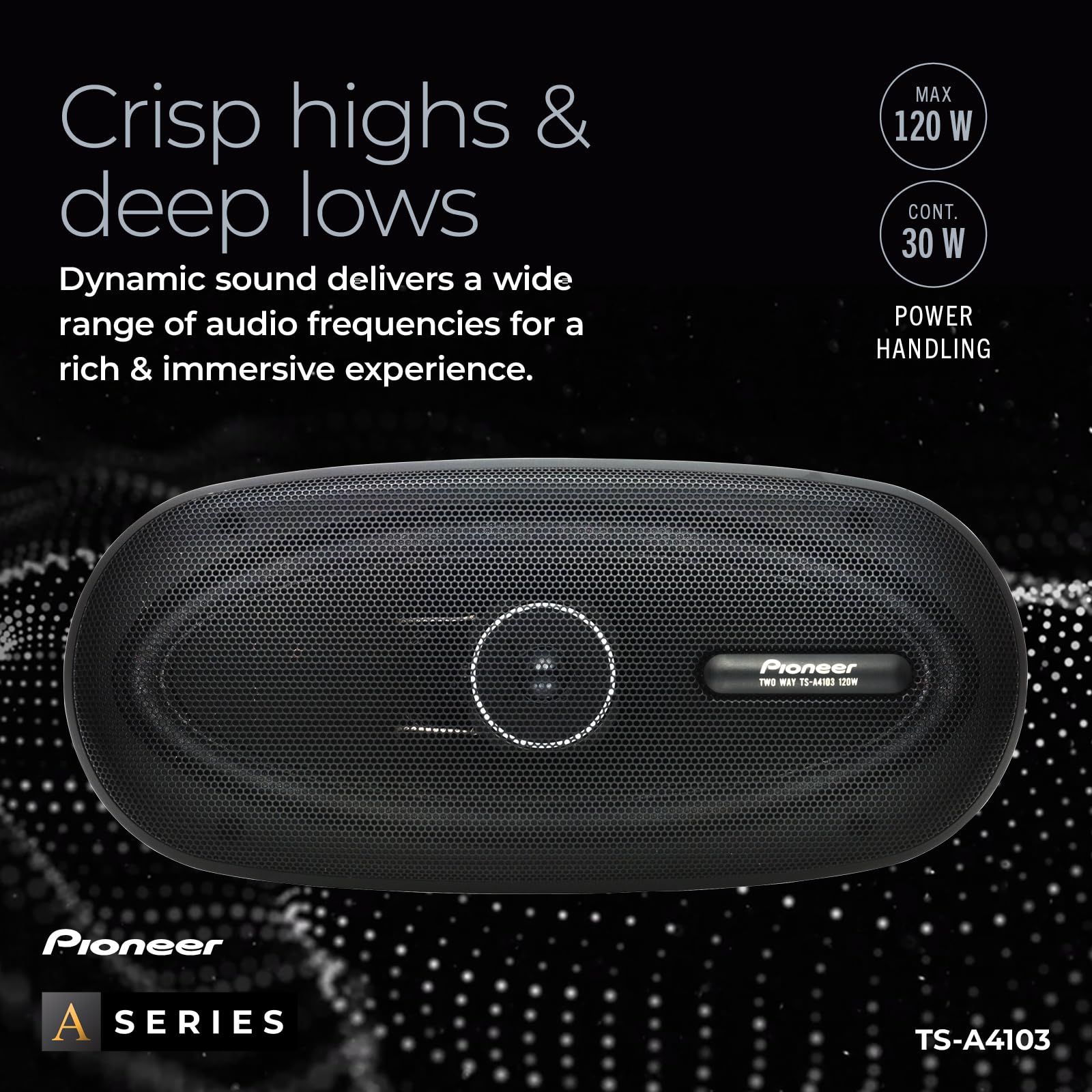 The TS-A4103 is equipped with Injection Molded Polypropylene (IMPP) cones blended with carbon fibers to provide superior strength and rigidity. This construction ensures powerful, distortion-free sound, even at higher volume levels. The 1-5/8-inch paper cone tweeter plays accurate highs, while the woofer offers full-bodied, deep bass. With a maximum power handling of 120 watts and continuous power handling of 30 watts, the TS-A4103 delivers dynamic sound without sacrificing quality, so you can enjoy vibrant, booming bass and clear vocals.
