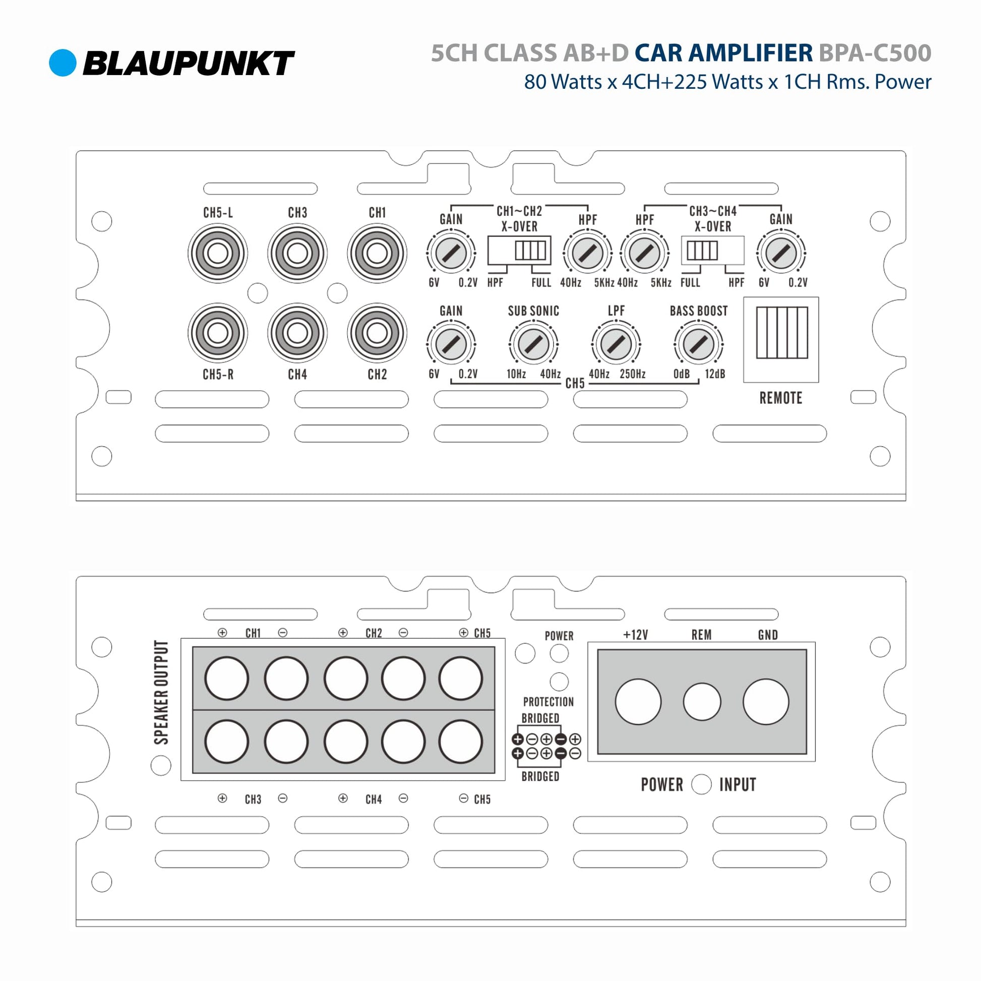 The Blaupunkt BPA-C500 is a cutting-edge 5-channel Class AB car amplifier designed to elevate your vehicle's audio system. This amplifier delivers an impressive 3600W of maximum power, offering versatility by powering your car's main speakers, subwoofers, and more. The addition of a fifth channel makes it possible to fine-tune your audio setup, allowing you to achieve the perfect balance of highs, mids, and lows for an immersive listening experience. With four channels powering your main speakers and a fifth channel dedicated to the subwoofer, you’ll enjoy deep, rumbling bass alongside crystal-clear vocals and crisp highs.