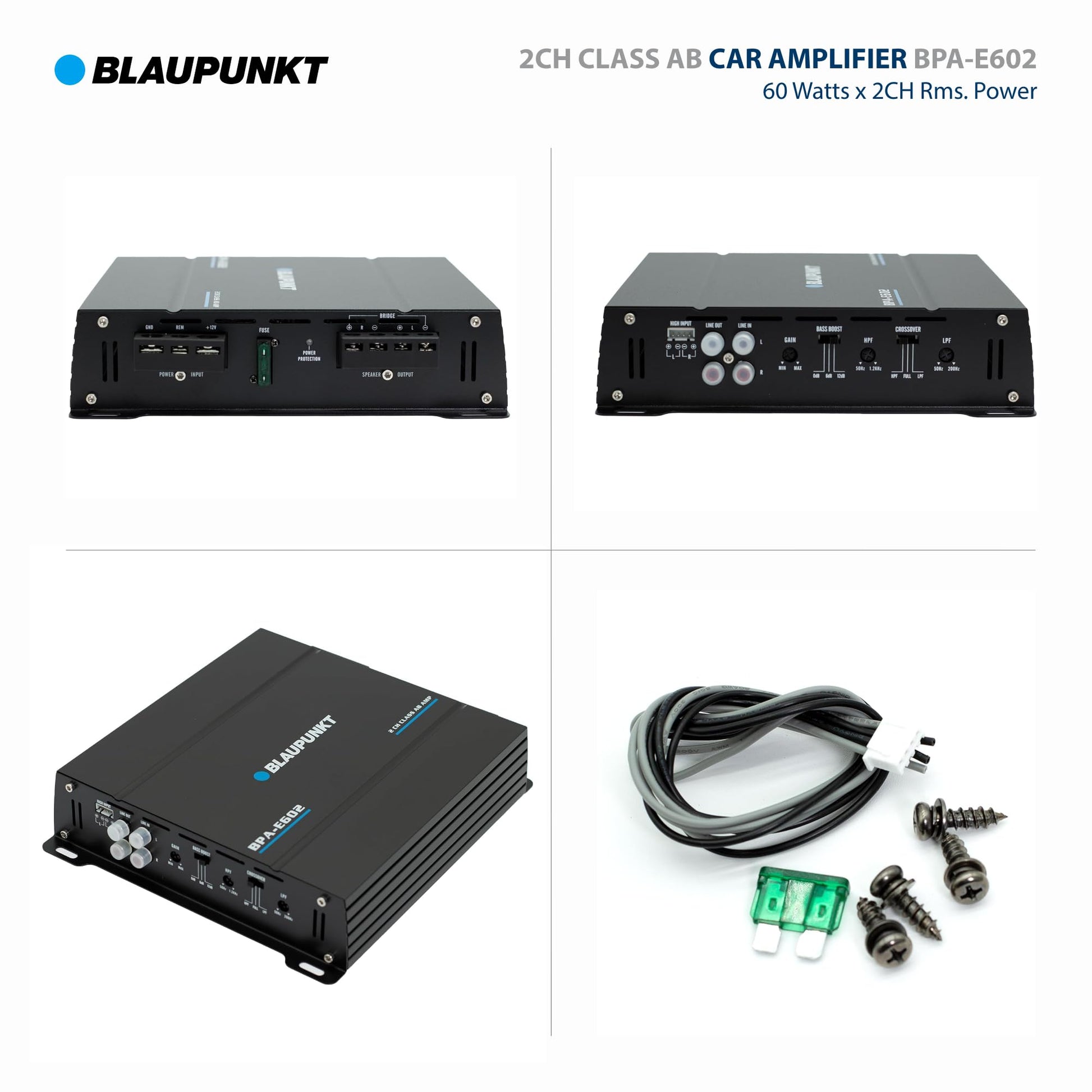 The Blaupunkt BPA-E602 is a 2-channel Class AB amplifier that delivers impressive 800W max power output, bringing your car's audio system to life with dynamic, distortion-free sound. Featuring a versatile 180W RMS in bridged mode, the amplifier enhances the bass and midrange frequencies for a rich, immersive listening experience. With multiple setup options, including 2 x 60W RMS at 4 Ohms and 2 x 90W RMS at 2 Ohms, the BPA-E602 offers flexibility to match a variety of speaker configurations and audio preferences, ensuring optimal performance for any car audio system.