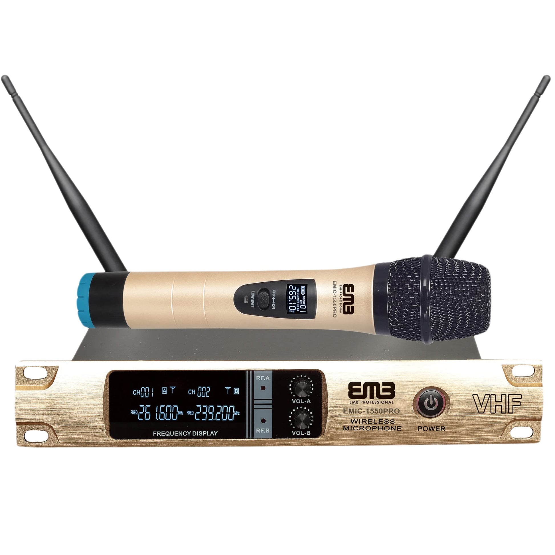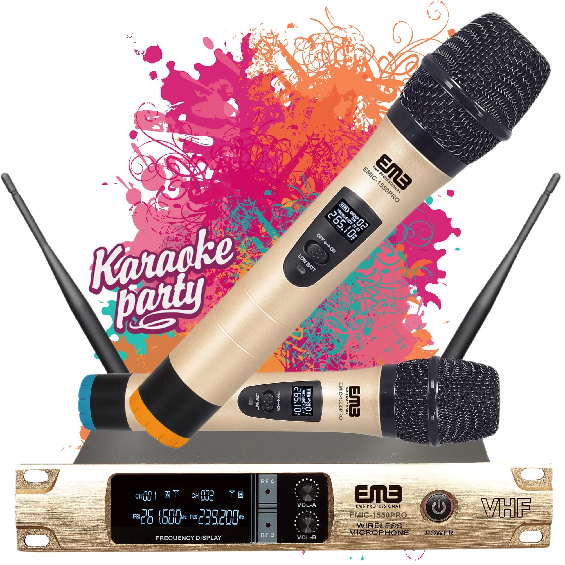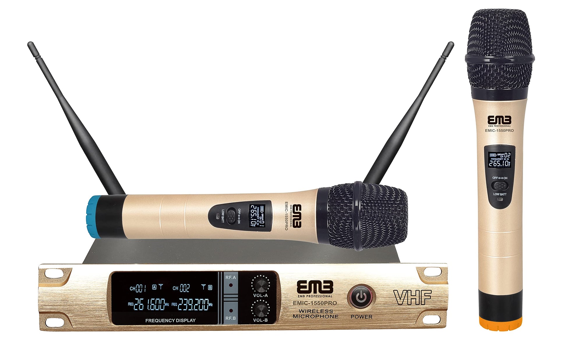 EMB EMIC1550PRO Dual VHF Wireless Handheld Microphone System with Rechargeable Receiver – Ideal for Karaoke, DJ, Weddings, Church, Stage, and Outdoor Events