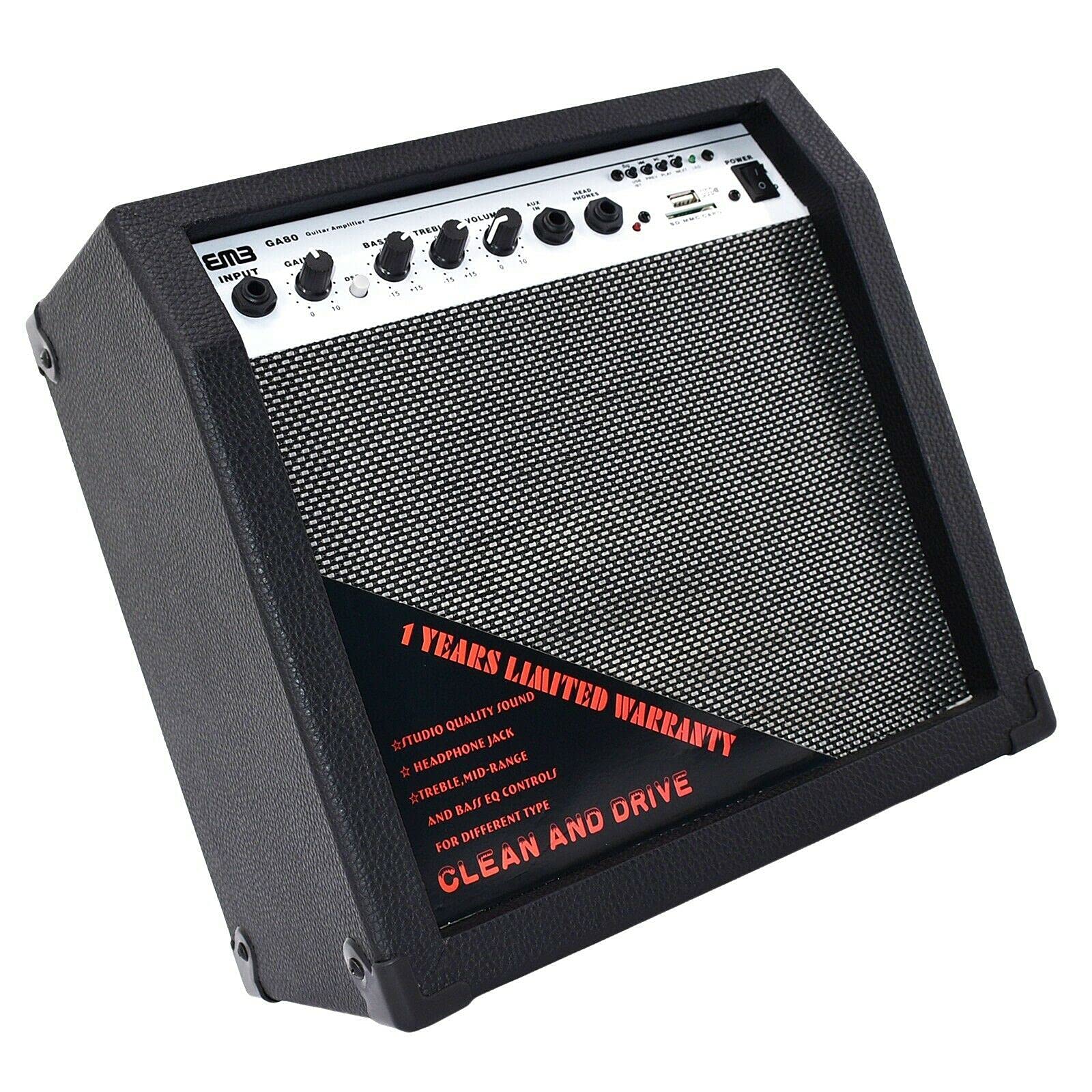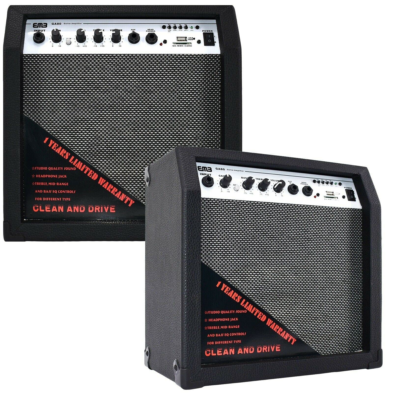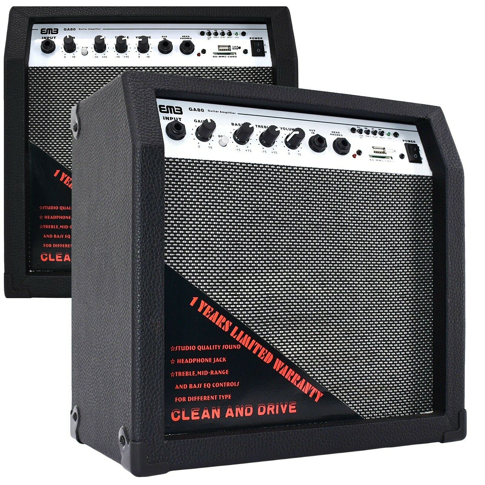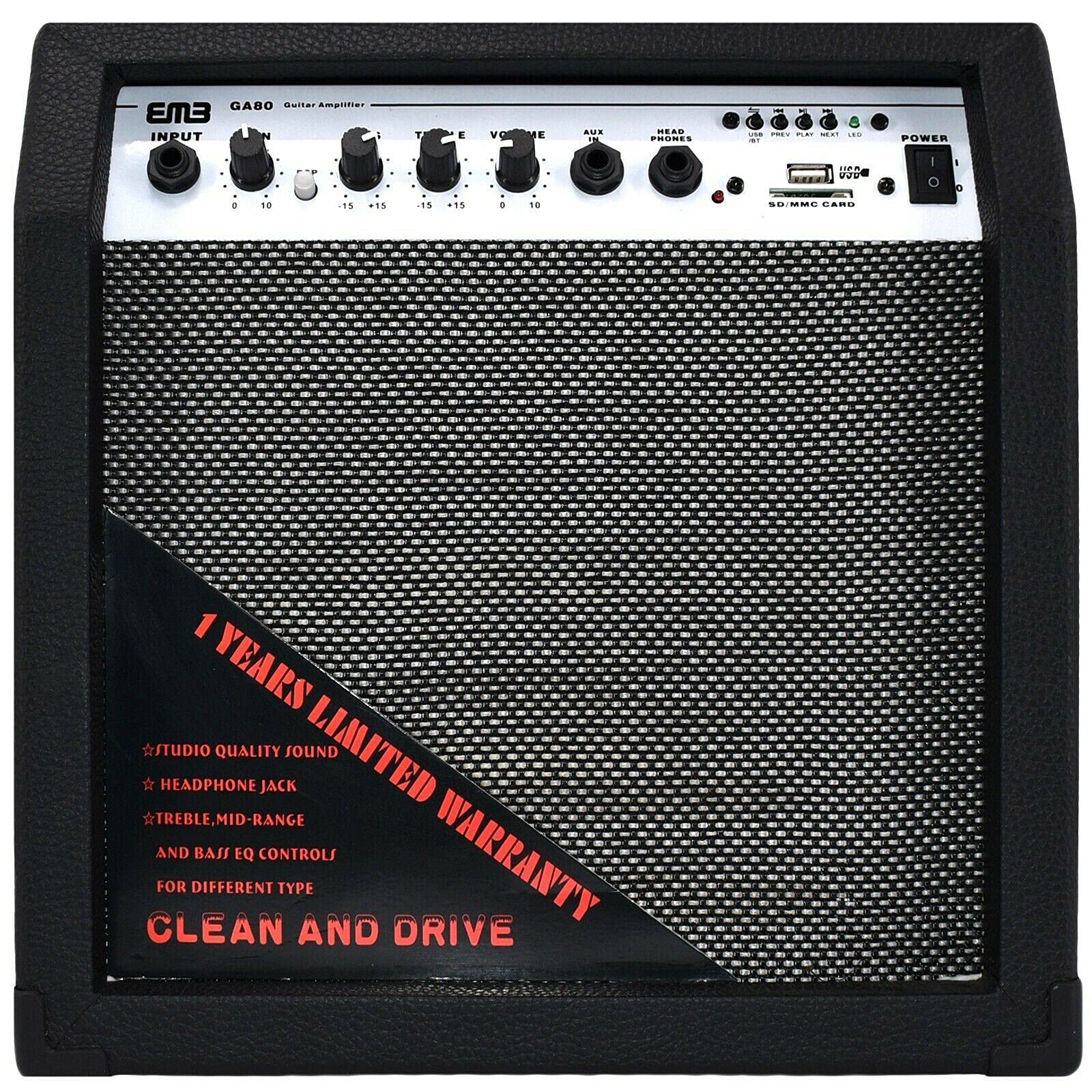 The EMB GA80-BK is a portable 350W guitar amplifier designed for musicians who need power and versatility in a compact format. Whether you're practicing in your bedroom or performing on stage, this amplifier is ready to deliver exceptional sound. With its 8-inch speaker and 350W peak power, the GA80-BK offers a rich, full tone, perfect for both beginners and experienced guitarists. The built-in Bluetooth allows you to easily stream your favorite tracks, while the AUX and SD USB inputs ensure you can jam along with external devices.