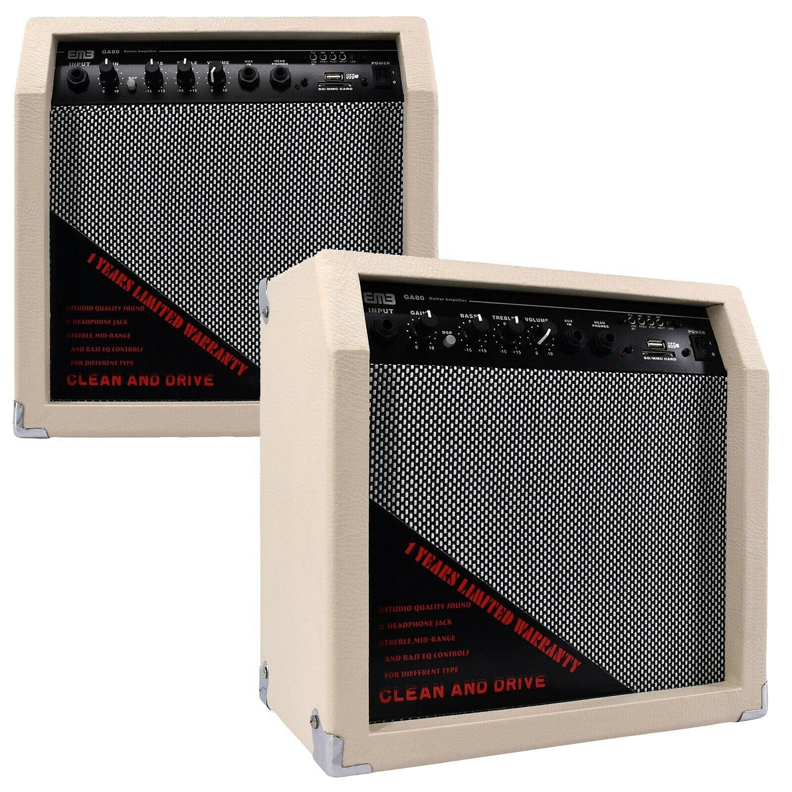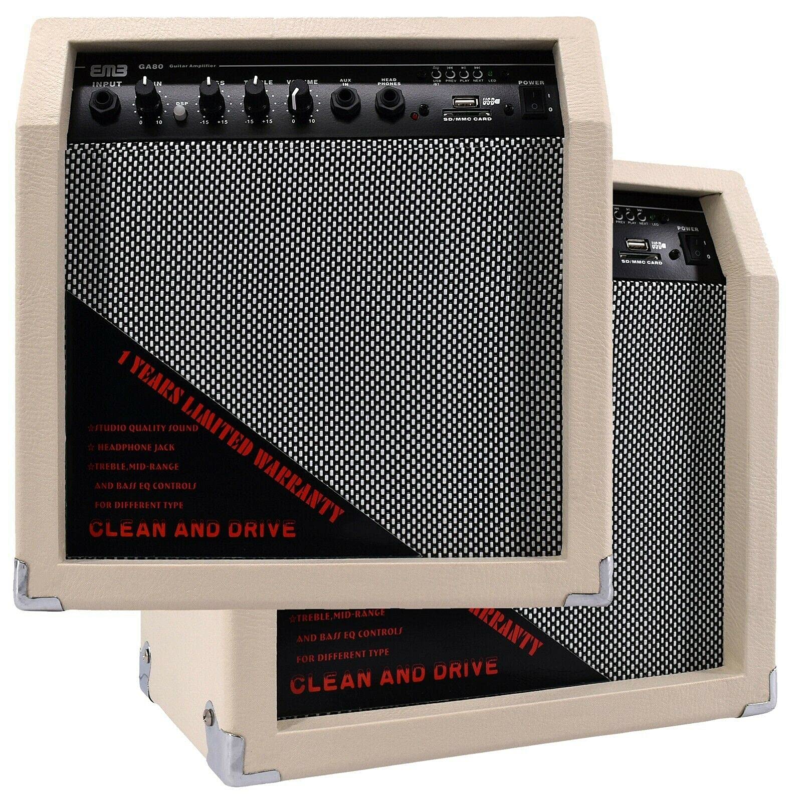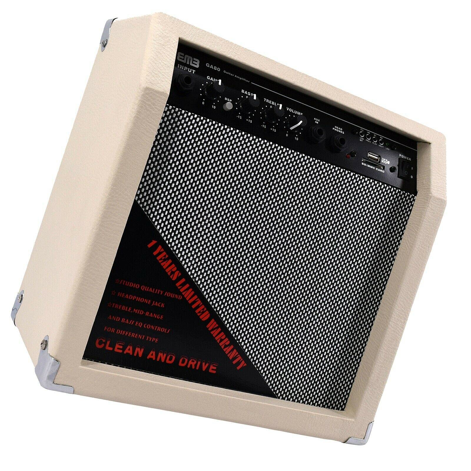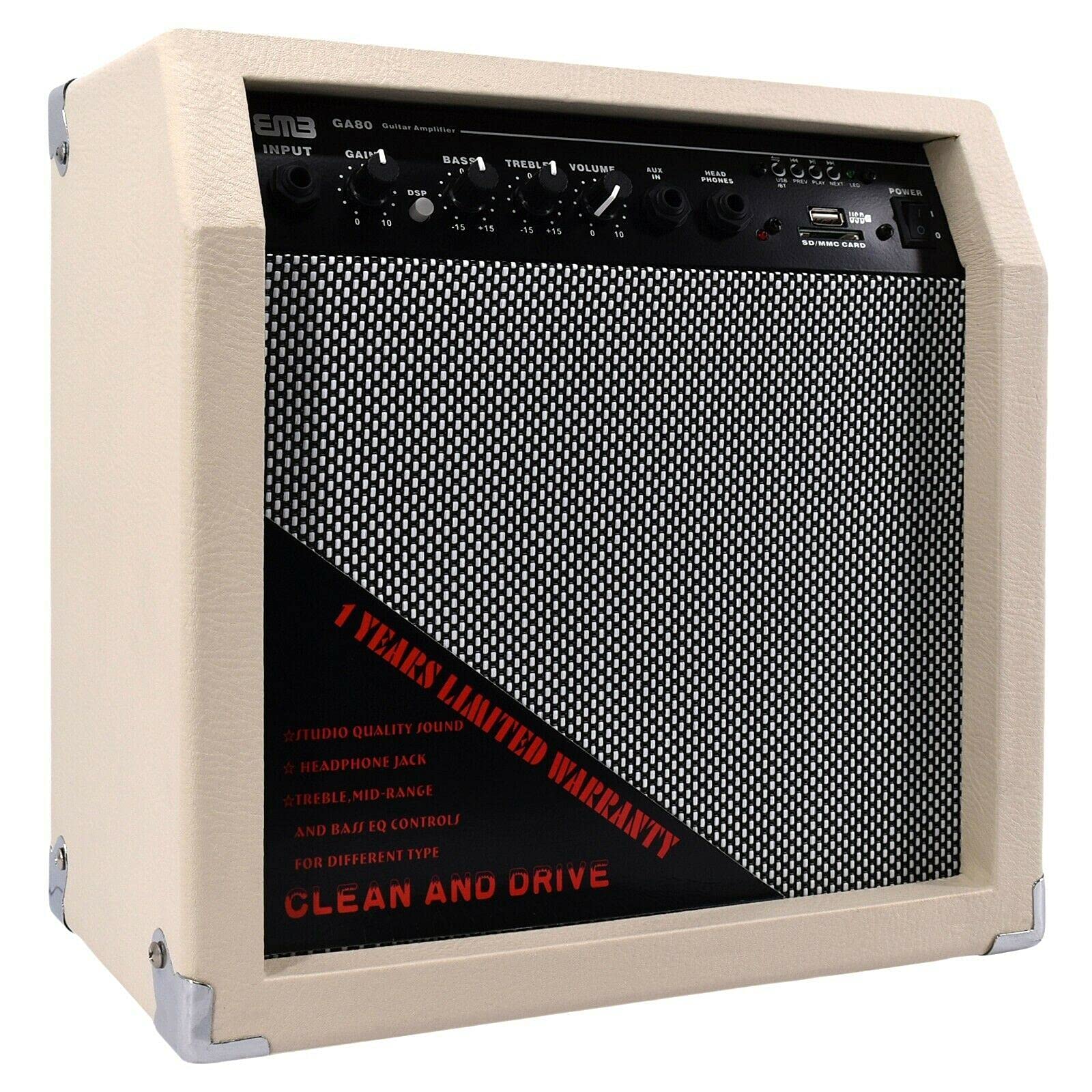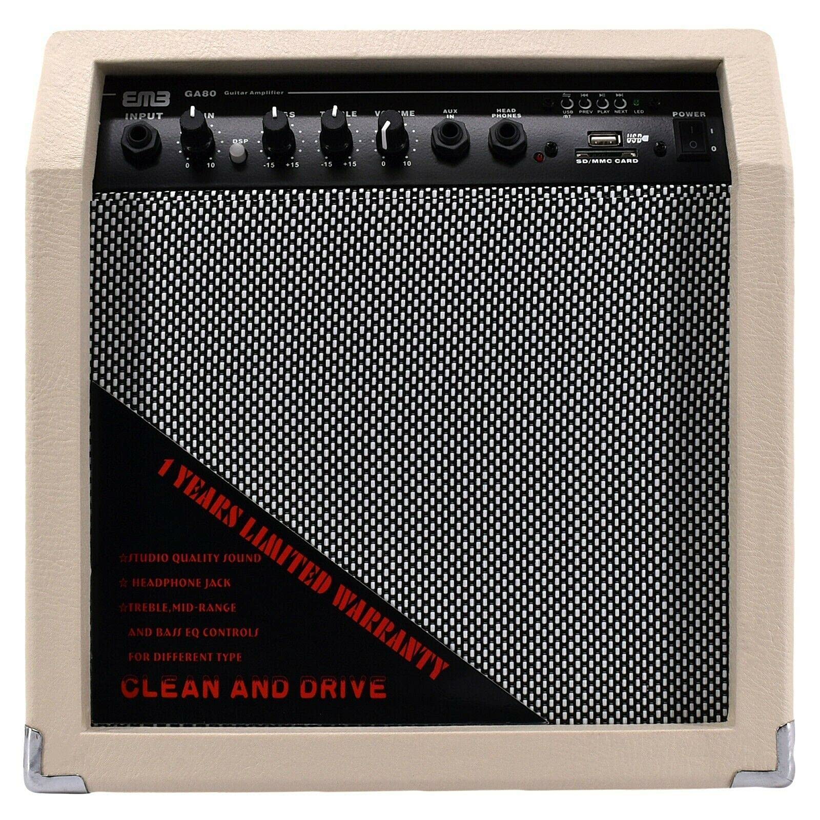 The EMB GA80-WT guitar amplifier delivers exceptional 350 watts of peak power through its 8-inch speaker, offering rich, dynamic sound for any environment. Whether you're practicing at home, jamming with friends, or performing on stage, this portable mini amplifier provides the volume and tone you need. Its sleek white design is perfect for any room, adding both functionality and style. Plus, the built-in Bluetooth connectivity allows you to easily stream music from your smartphone or any Bluetooth-enabled device, enabling you to play along with your favorite tracks.