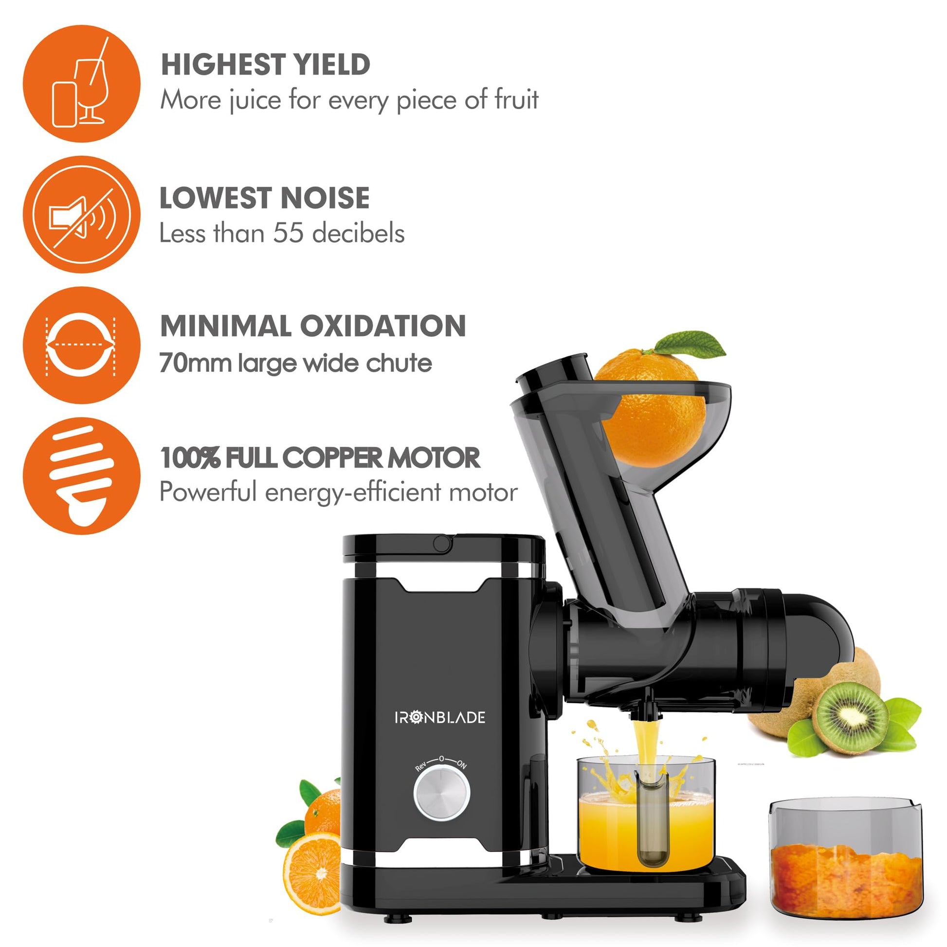 Featuring an advanced full copper motor, the IronBlade IBLJU30 operates at less than 55dB, ensuring a peaceful juicing experience—perfect for early mornings or late-night use. The 70mm wide chute allows you to juice whole fruits and vegetables with minimal prep, saving time while making the process more convenient. Its horizontal design provides stability and efficiency, extracting more juice with less pulp.