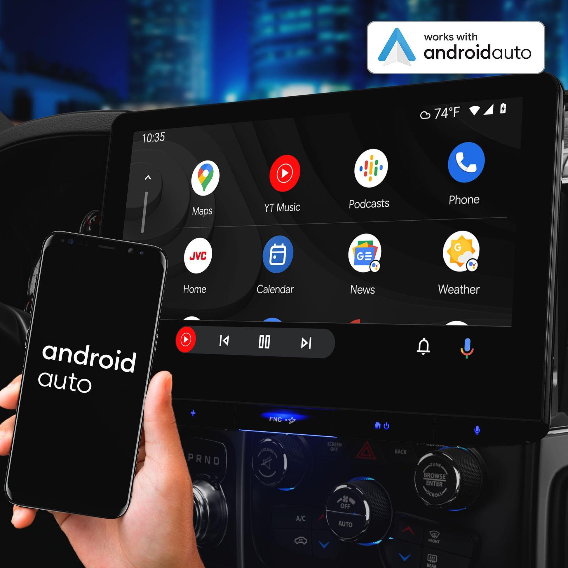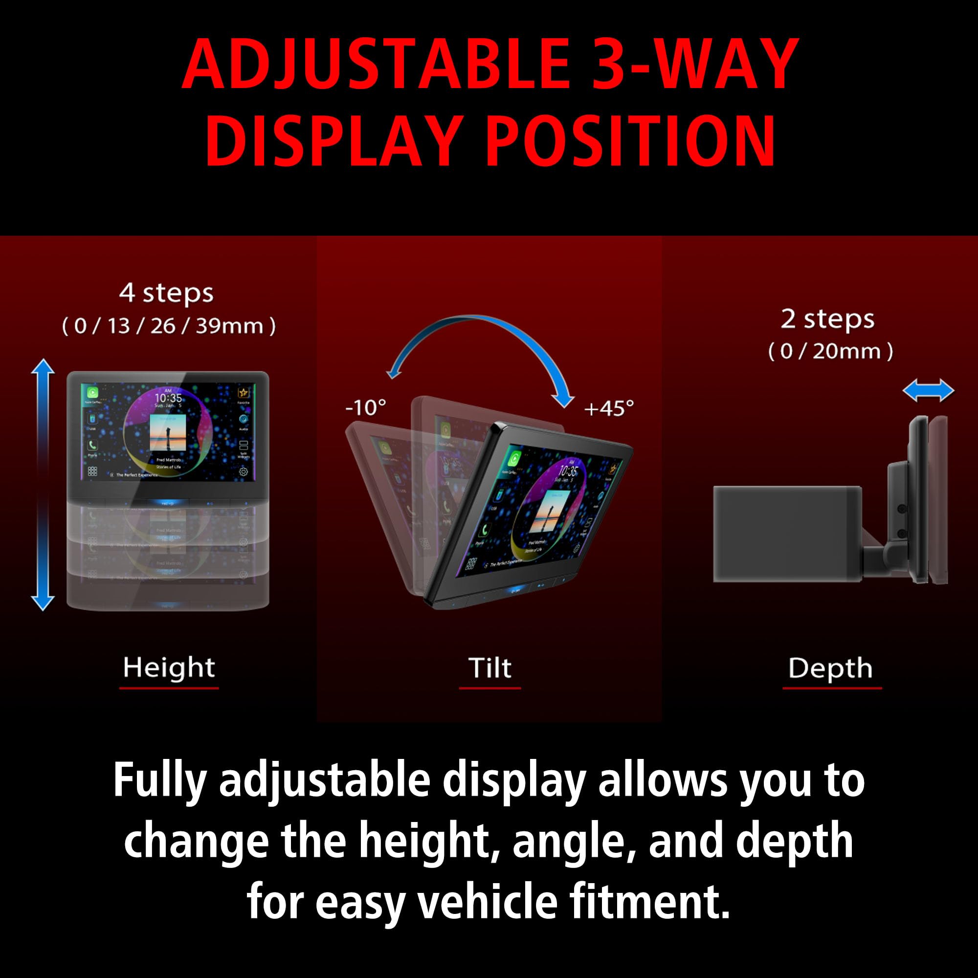 The JVC KW-Z1000AW features a 10.1" high-definition capacitive touchscreen display with gesture touch control. Customize your dashboard with variable key illumination, dimmer settings, and multilingual display options. The display tilts for optimal visibility and offers a modern, floating design that enhances any vehicle interior.