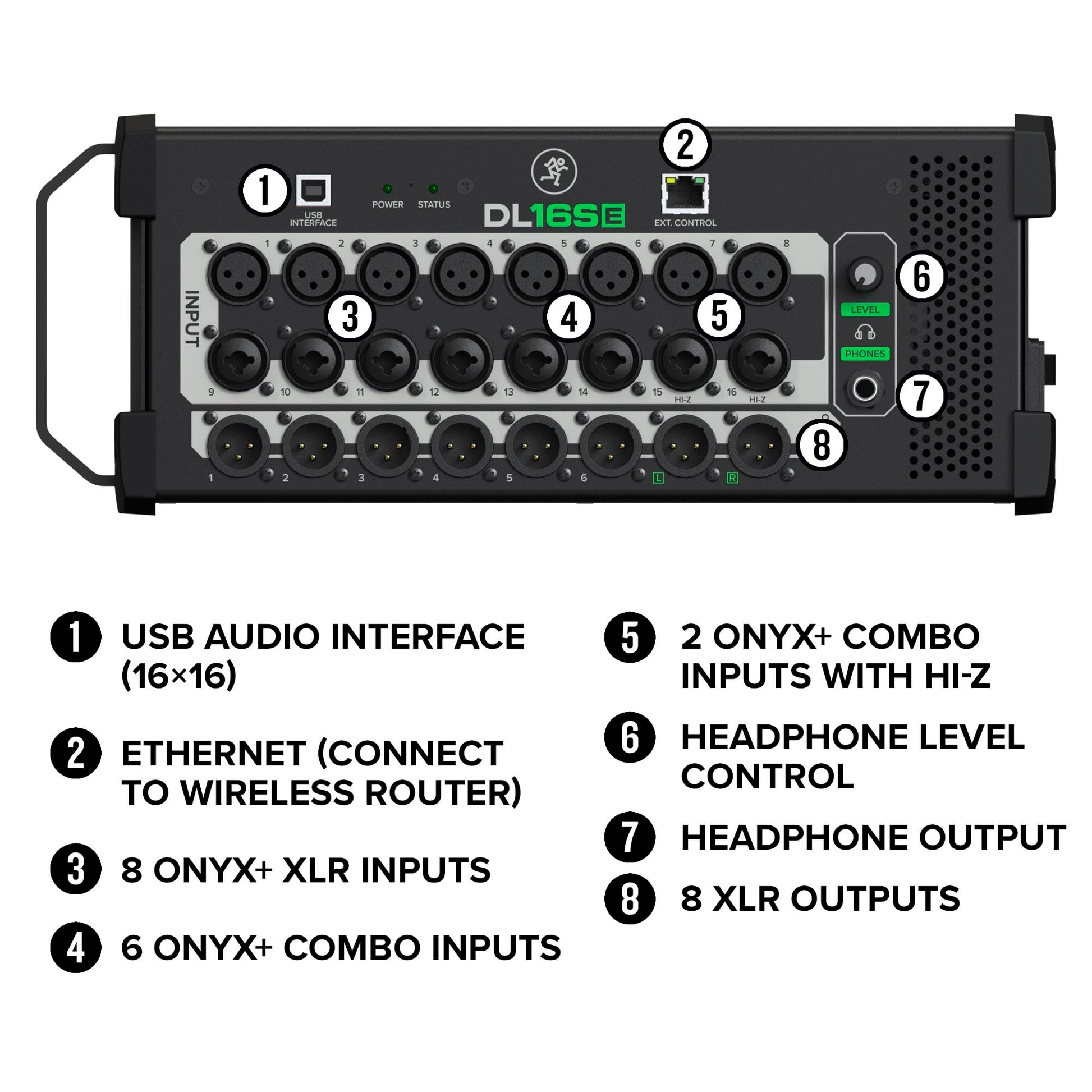 - 16 Onyx+ Mic Preamps – High-quality preamps deliver crystal-clear audio for all your input channels.