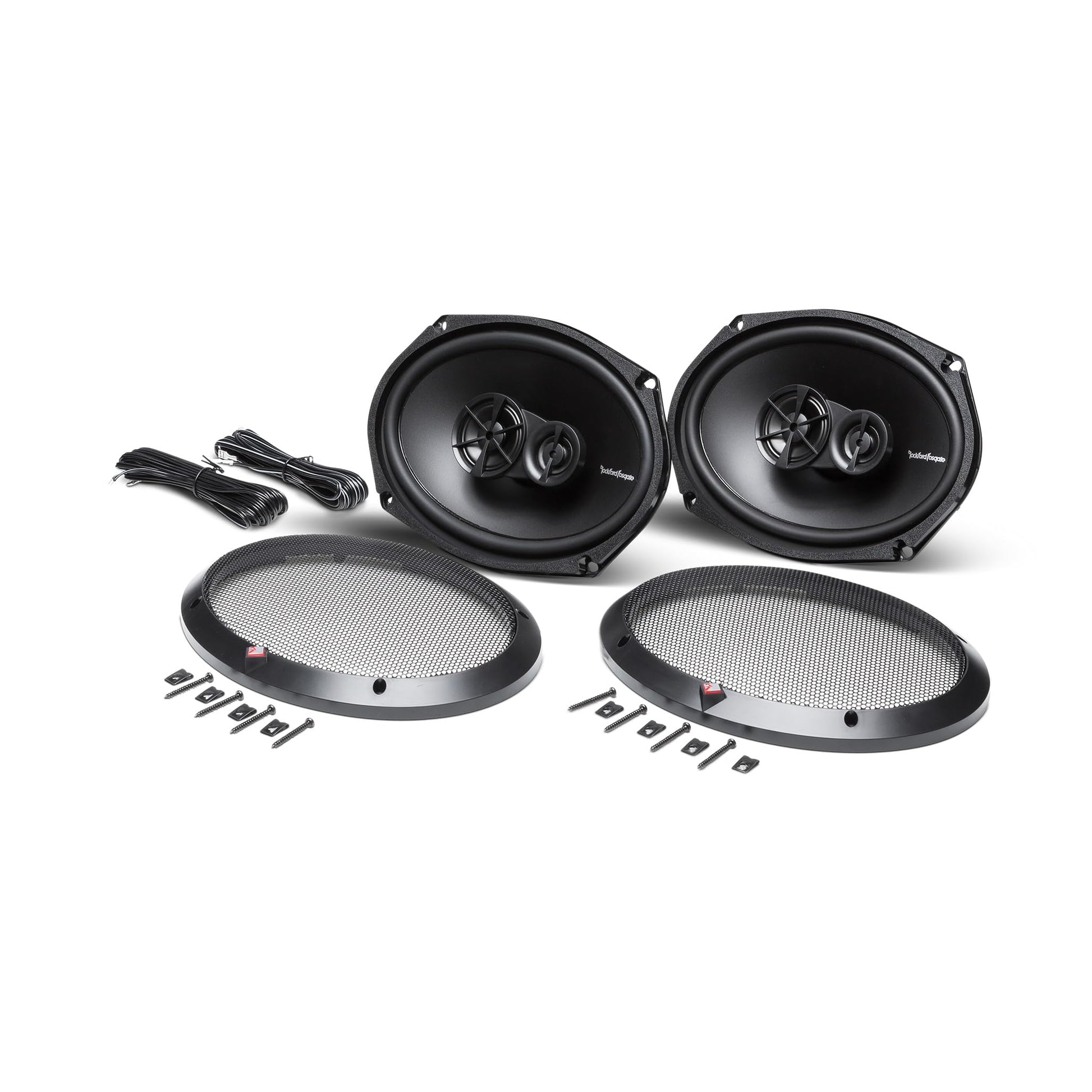 The Rockford Fosgate R169X3 6" x 9" 3-Way Full-Range Speakers are engineered to deliver premium sound performance in your vehicle. These 4-Ohm speakers feature polypropylene cones that produce clean, distortion-free bass, while the silk dome Piezo tweeter and midrange driver offer crisp highs and balanced midrange frequencies. Capable of handling 65 watts RMS and 130 watts max, they ensure powerful output even at high volumes. The high-pass crossovers enhance sound clarity by improving frequency response, and the speakers include mounting hardware and grilles for easy installation and sleek aesthetics.