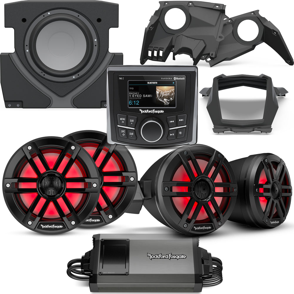 The Rockford Fosgate X317-STG4 Audio Kit is the ultimate sound upgrade for your 2017 and newer Can-Am Maverick X3, delivering powerful, clear audio in even the harshest off-road environments. This comprehensive system includes the PMX-2 marine digital media receiver, which features an AM/FM/WB tuner and built-in Bluetooth for music streaming. Whether you're riding through the dirt or the dunes, the PMX-2 ensures you stay connected to your favorite tunes via USB or AUX inputs. This receiver also comes with a built-in 4-channel amplifier (25 watts RMS/50 peak x 4), perfect for driving the system’s components.